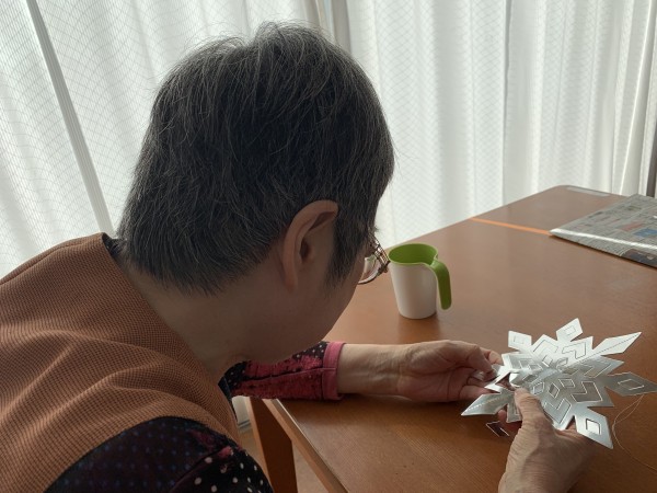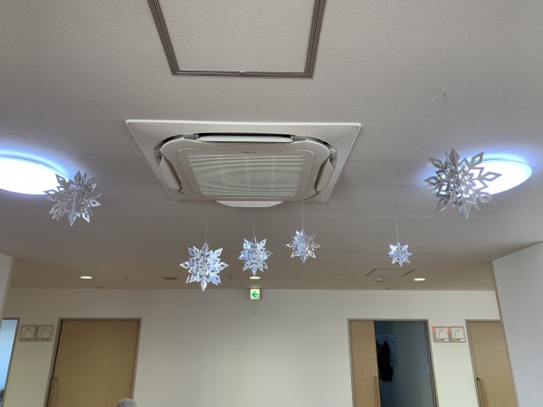 先日飾った雪の結晶を違うフロアでも飾ります。