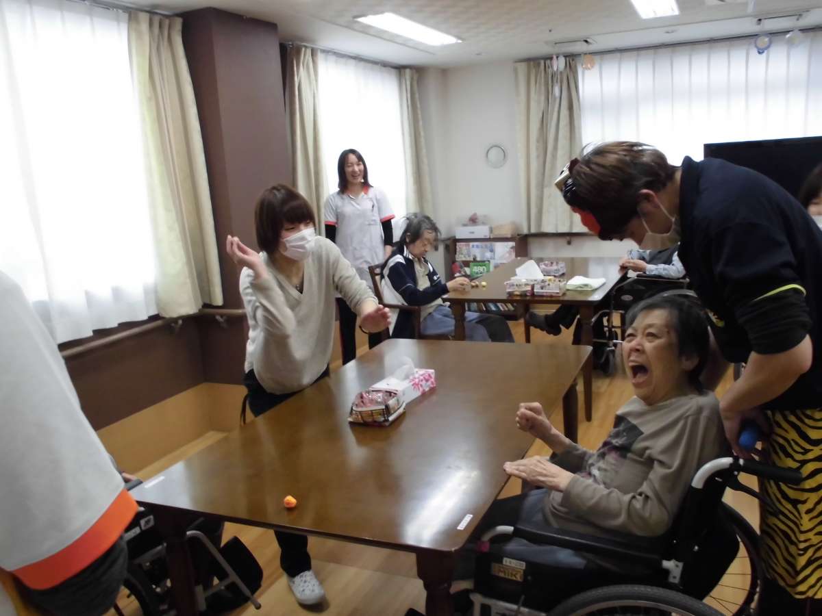 鬼にふんした男性介護職員にご利用者様が豆(紙を丸めたもの)を投げつけ鬼を退治しました