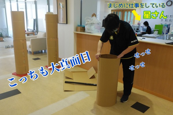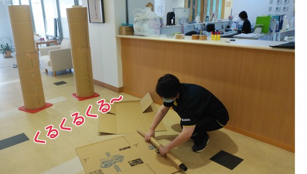 丸めた段ボールを、柱に乗っけてます!