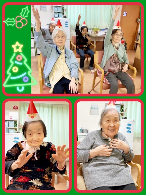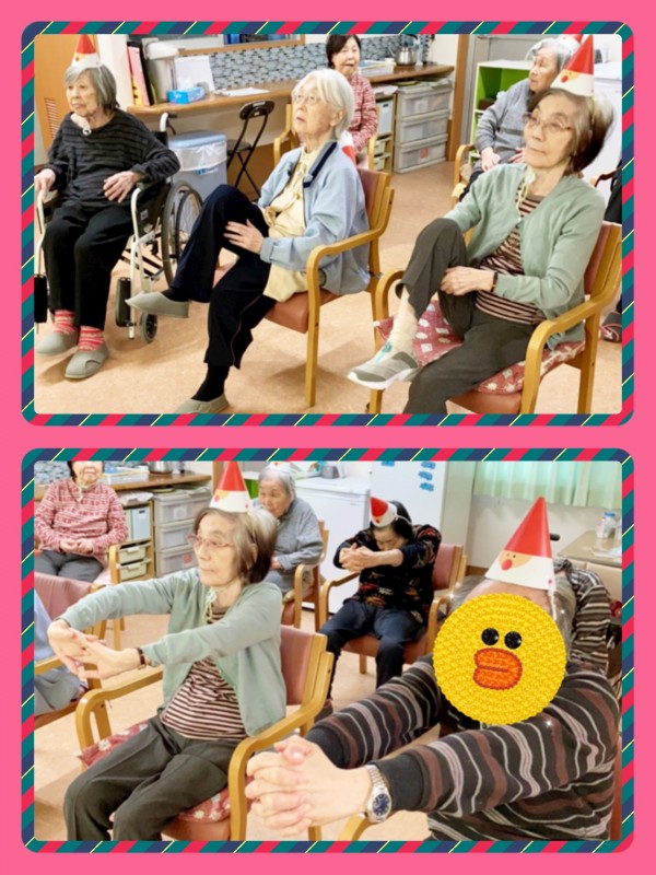 みなさん、サンタの帽子をかぶり、ジングルベルの曲に合わせてリズムよく身体を動かしています。
