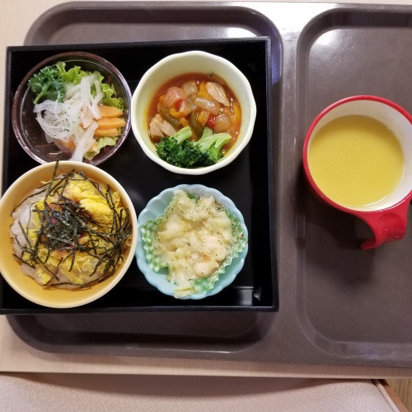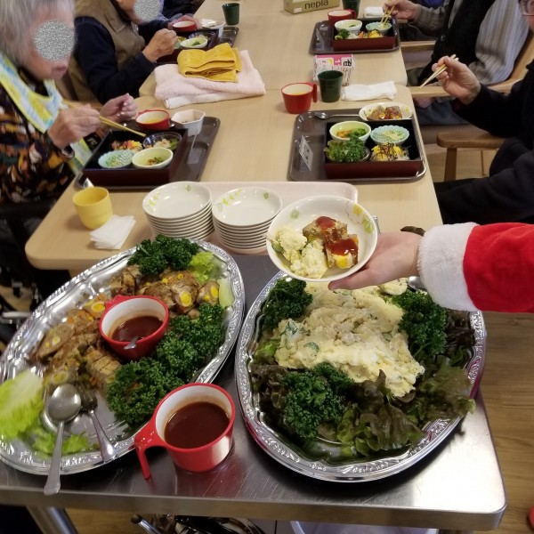 まずはスタッフの衣装と昼食(クリスマスメニュー)のご紹介です