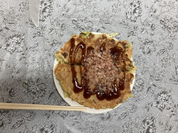 お好み焼きを食べる様子です。ぃぃ笑顔です。