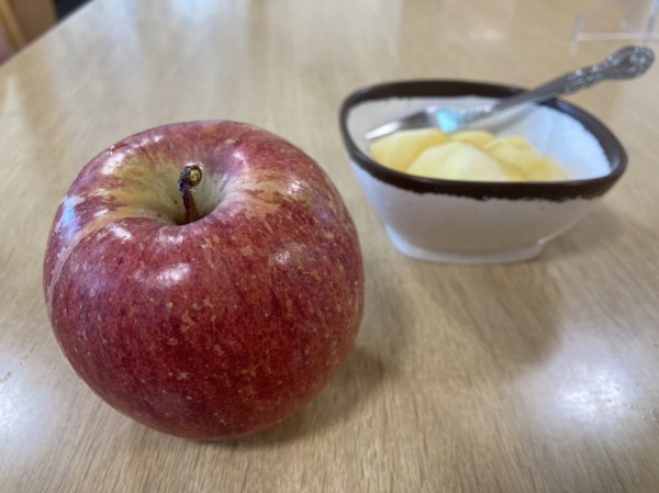 「〇〇さん、今日のおやつはご家族様が持ってきて下さったりんごですよ。」