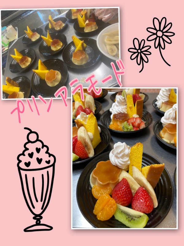 皆さんの大好きなプリンアラモード、生クリーム増し増しで作りました。(笑)(*^^*)