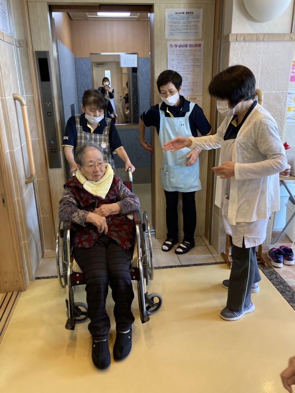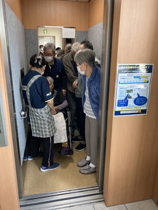 ホーム長の合図で職員は1階の利用者様をエレベーターを使用して2階と3階に避難誘導しました。