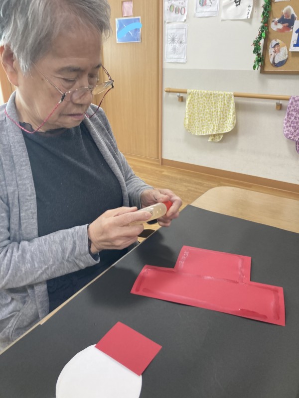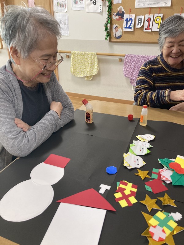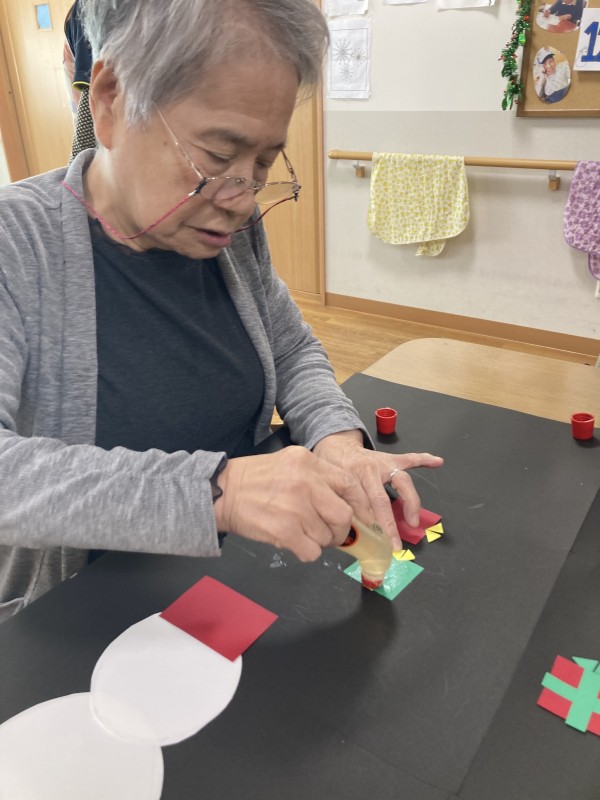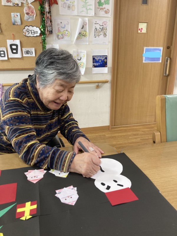 職員さんに「サンタ可愛く描けたね!」と話すとよい笑顔をいただきました。