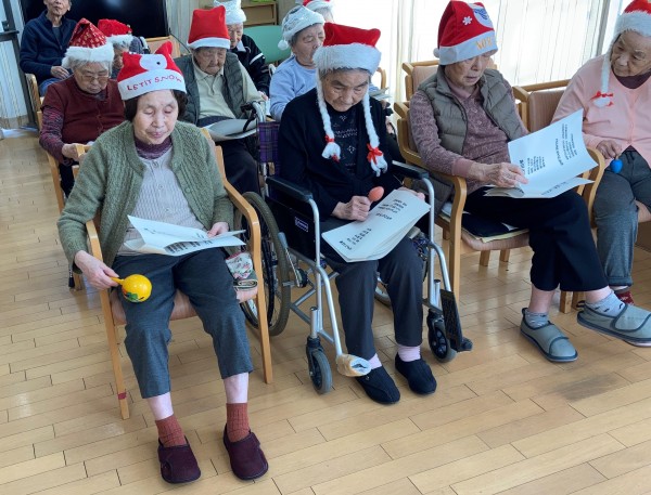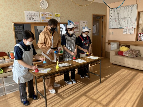 クリスマス会を行いました。職員頑張ってハンドベルで演奏すると、