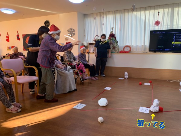 雪だるまめがけて球を投げる入居者様。