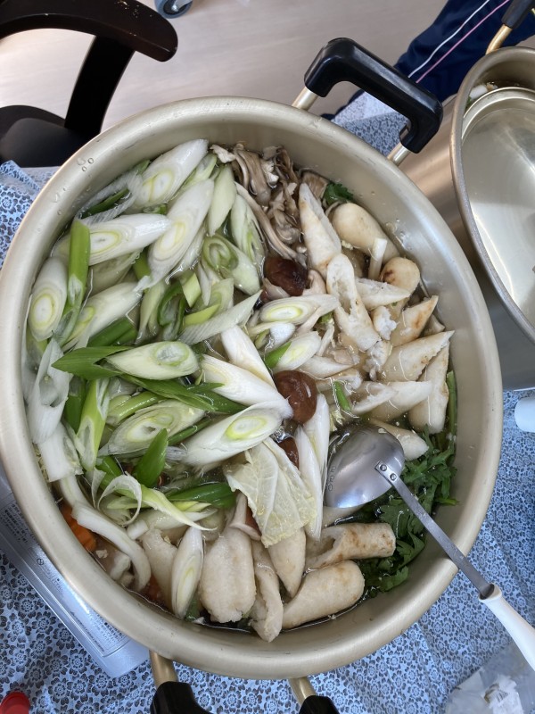 きりたんぽの材料として、きりたんぽ・ごぼう・舞茸・里芋・鶏肉・春菊・人参・白菜・ネギ・椎茸等たくさんの具材を使用しました。出汁を取っている段階でぃぃ匂いが漂って来て、きりたんぽ鍋を作成しているフロアだけでなく、エレベーター等を通して全てのフロアにぃぃ匂いが漂い、ホール全体にぃぃ匂いが充満しました。レク等はあまりお好きでなく、普段は居室にて過ごされる方も、「ぃぃ匂いがするから来てみた」と仰って来て頂く事が出来ました。(( ´∀` )