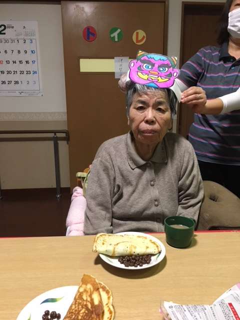 皆様、鬼になりきった職員に向かって豆を投げ、厄が来ない様に、幸せが来る様にと想いを込め…ご利用者様もお面をかぶって鬼になったりと、節分を満喫されていました(*^_^*)