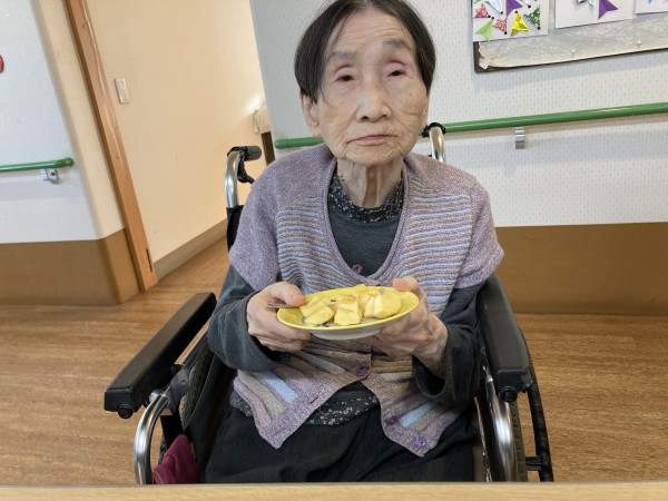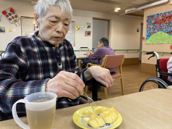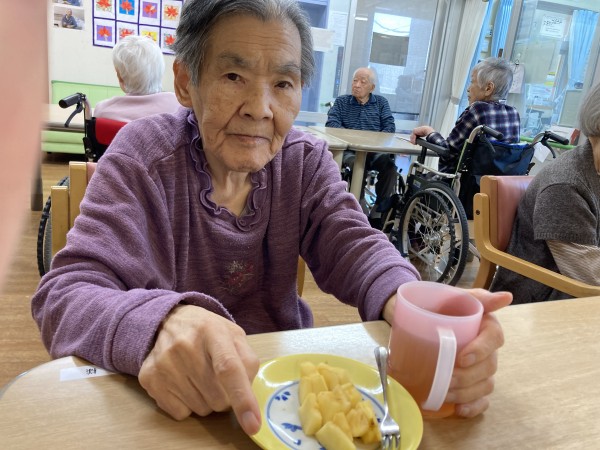 今日のおやつの時間に入居者様のご家族様から頂いたリンゴを皆さんで召し上がっていただきました(^^♪