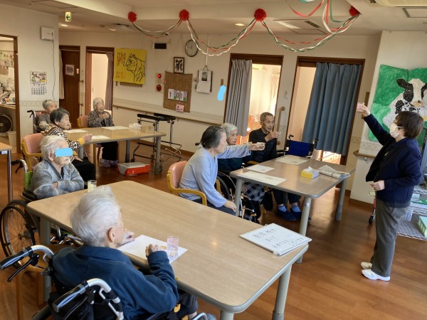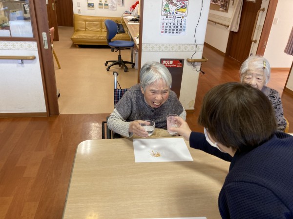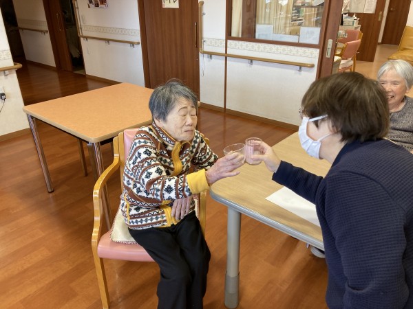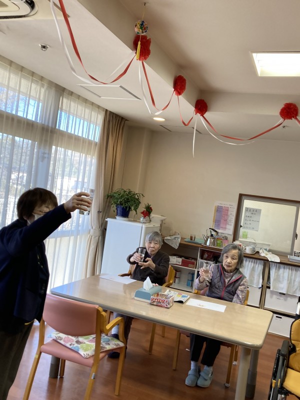 昼食の時に「お屠蘇」の代わりに「サイダー」でしたが、利用者様皆さんの一年間の邪気を払い、長寿を願い乾杯!