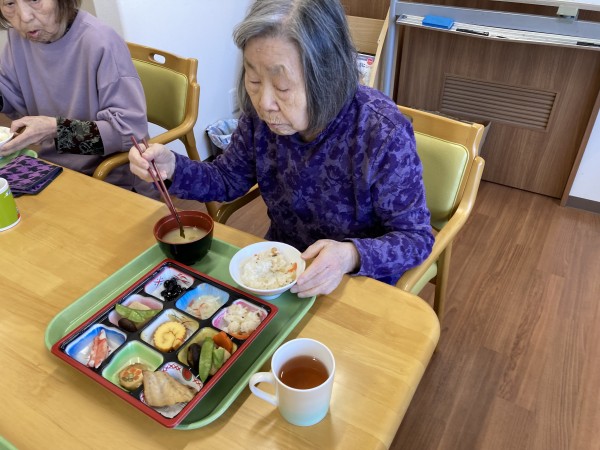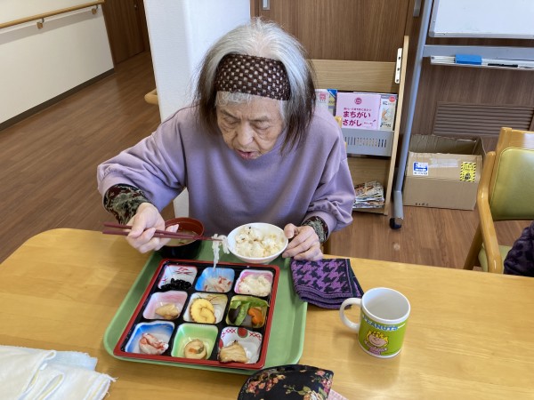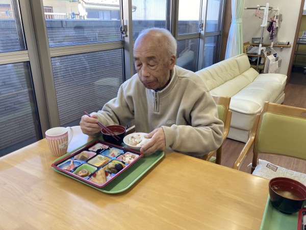 こんにちは!グループホームみんなの家・あきがせの介護ブログです。よろしくお願いいたします。2階の1月元旦、おせち料理の召し上がられているご様子です///
