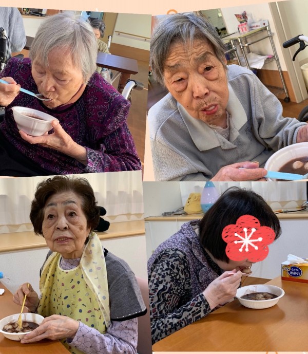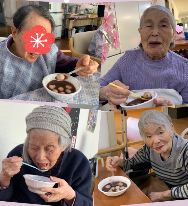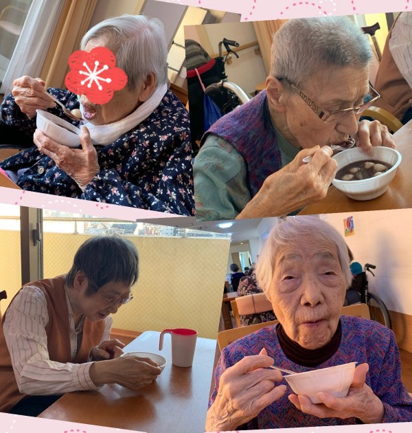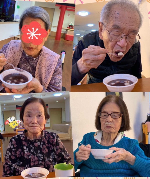 本日は、お汁粉を召し上がる入居者様方をご覧いただいております。