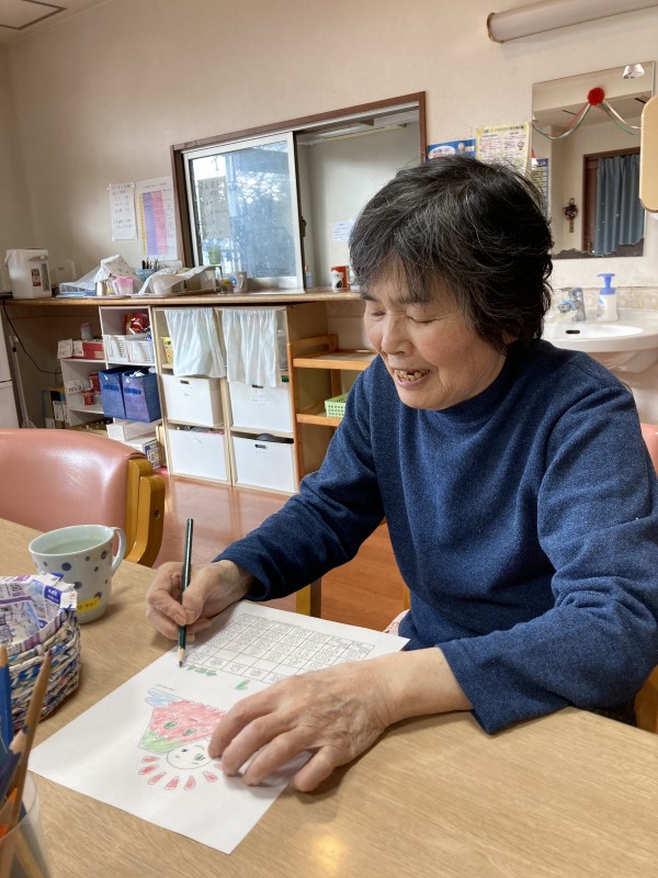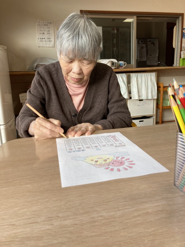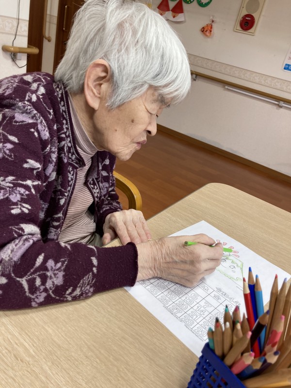 1月のカレンダーを利用者様皆さんでご自分のお部屋に貼るのに、色鉛筆やクレヨンで利用者様が思うように考えながら色塗りをしています。