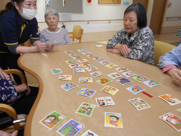 丸くなって和気あいあいとカルタ取りをする利用者様~