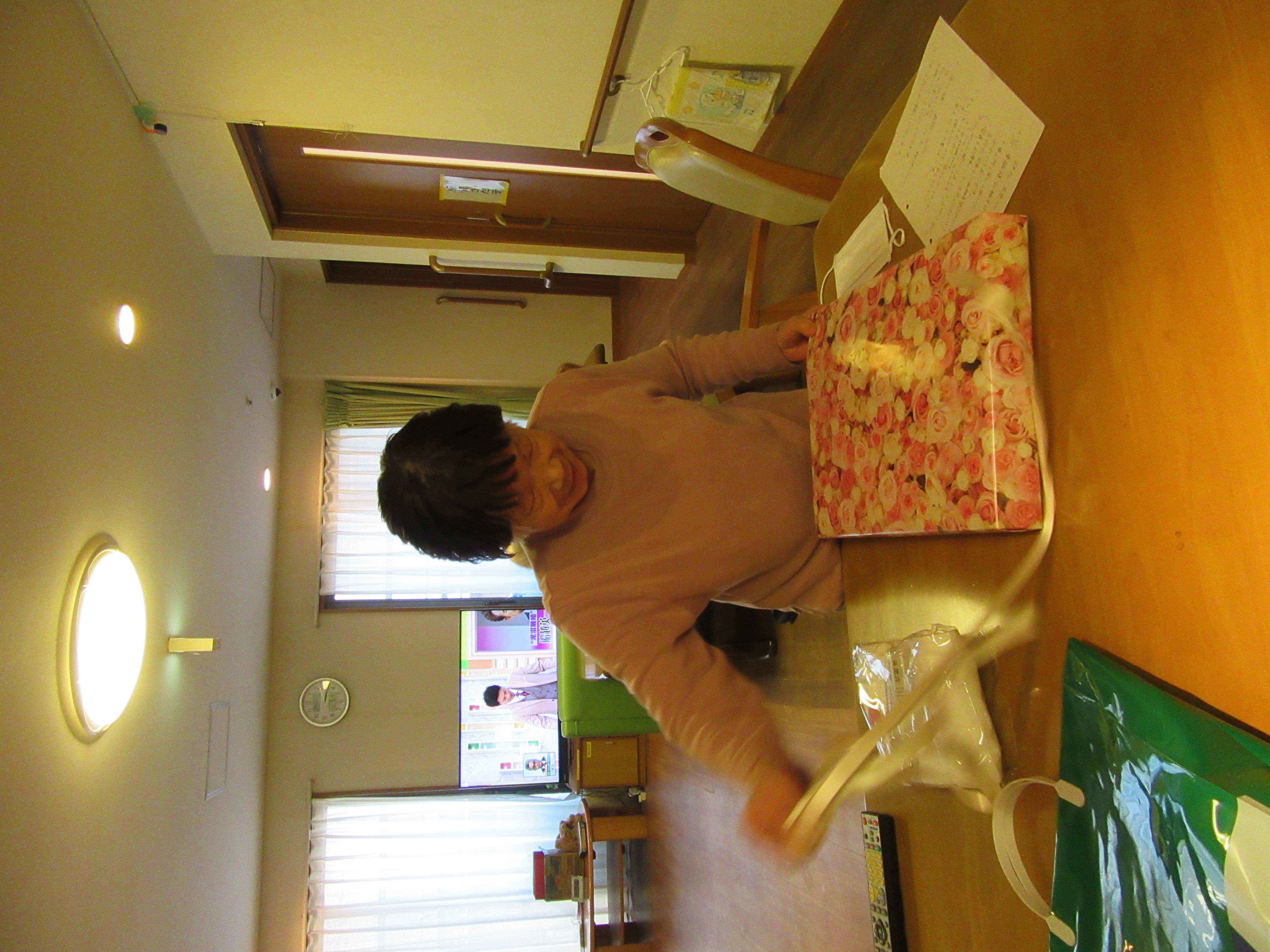 ご家族からのプレゼントをお渡しすると「うれしいわ~、何かしら?」・・・中にはなんと大好物の干し芋と素敵なタオルケットが入っていました!干し芋はさっそくおやつに。「これなつかしいわ、おいしわぁ~」と満面の笑顔。素敵なお誕生日になりました。