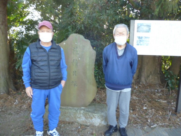 花積貝塚の遺跡の前でハイポーズ。