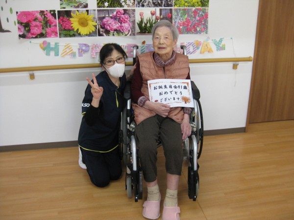 1/13 93歳になりました。お誕生日おめでとうございます! 健康で楽しく過ごしていきたいと話されていました。職員一同、安全にお過ごしいただけるようにサポートしていきたいと思います。