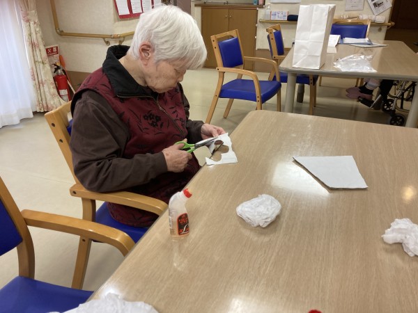 先日は、ここ吉川にも雪が降り積りました。近所の庭先には可愛い雪だるまが出来ていました。常に適温の室内で過ごされているご利用者様に季節感を感じて頂こうと雪だるまを作る事にしました。白いお花紙で小さなお花をいっぱい作り、雪に見立てて、貼り付けます。「のりが上手くつかないよー」「デブの雪だるまになった」など色々おしゃべりしながら頑張ってます。