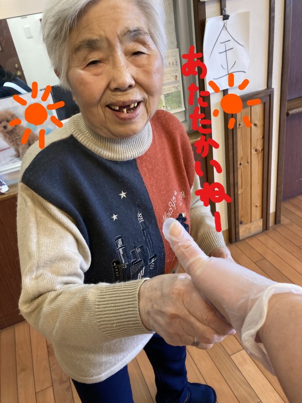 まずは、手の温度が常に高めが唯一自慢!(笑)の職員が、温めましょう!