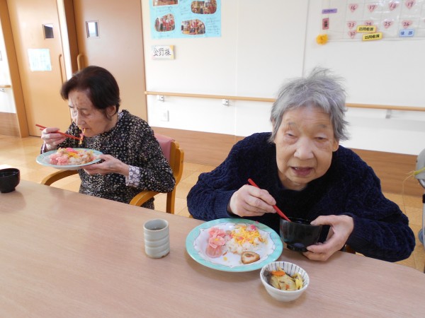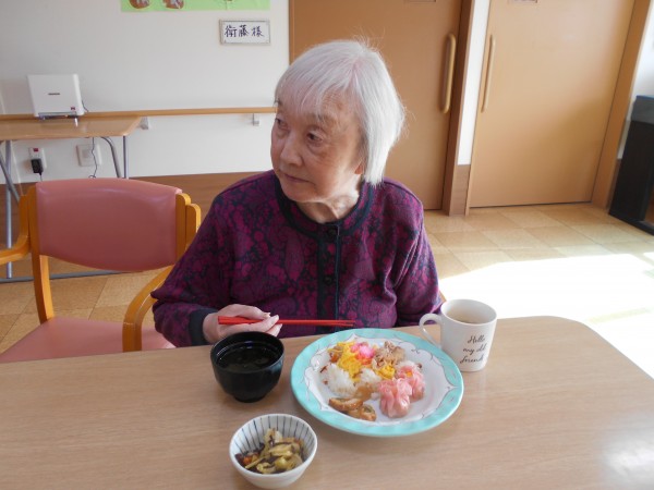 スタッフ手作りのちらし寿司、可愛い焼売と肉巻きを各フロアで召し上がりました。