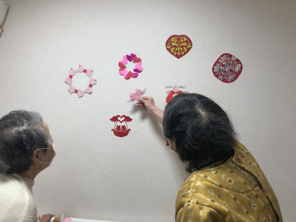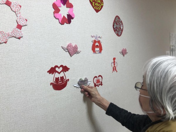ご利用者様と一緒に壁の飾りをバレンタインバージョンに変更しました(^^♪