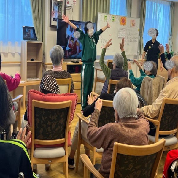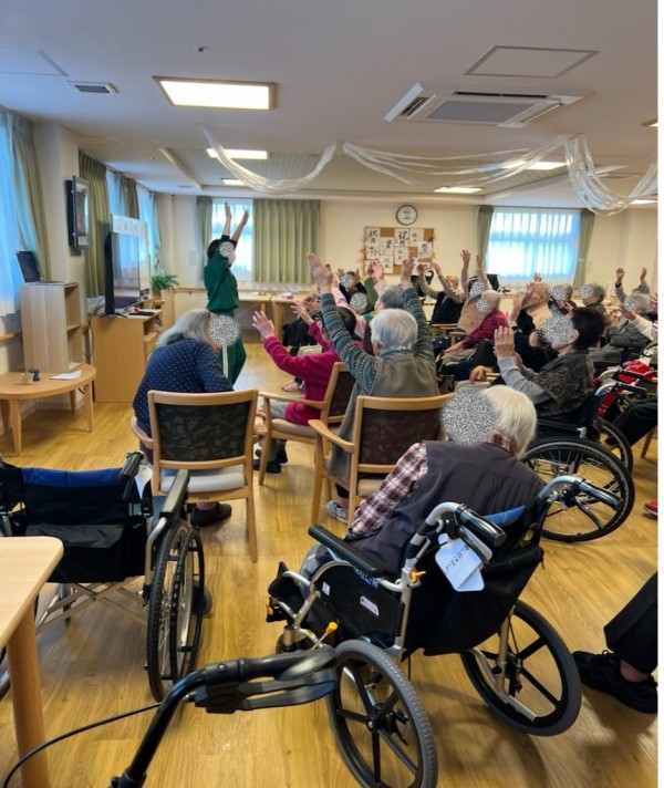 こんにちは。本日は職員がインストラクターを務めて体操しましたよ