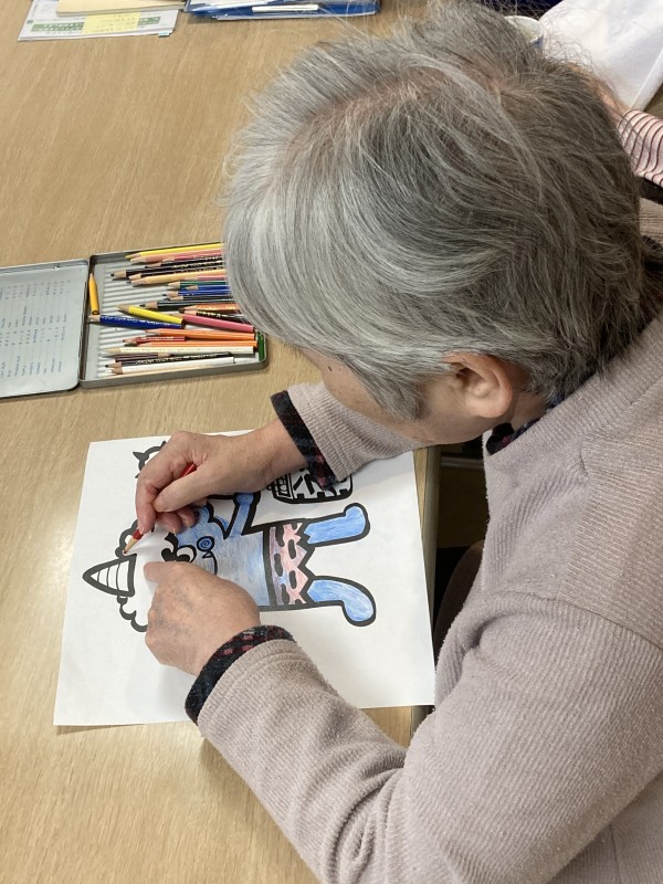 皆さんが楽しそうに取り組んでいるのはちぎり絵です。赤鬼と青鬼の絵が出来上がってきました。