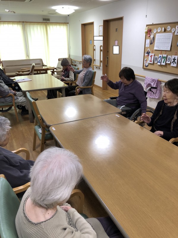 頭を回転させることにより、脳の活性化を図るとともに利用者様同士のコミュニケーションにもなって、いいレクリエーションですね~(^^♪