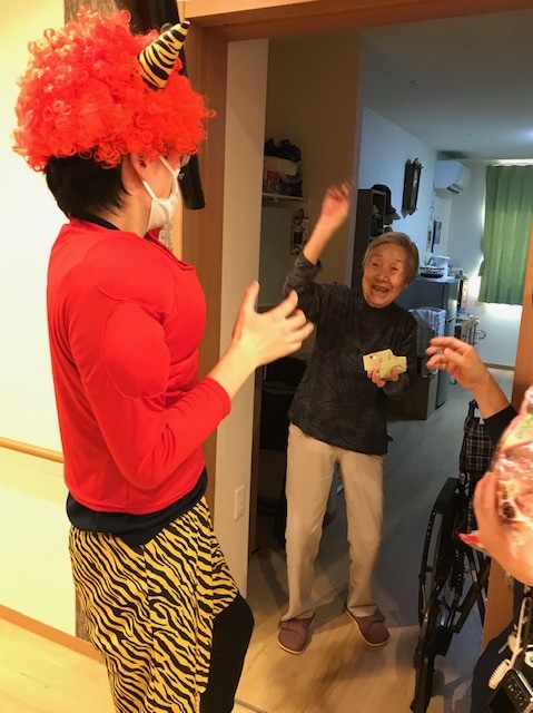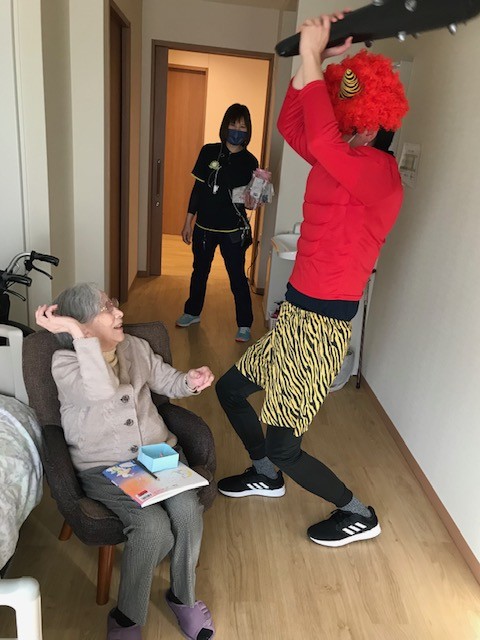 今回は、お客様に集まってもらわずにお客様一人一人のお部屋へお邪魔し、用意した甘納豆で豆まきをしてもらいました。