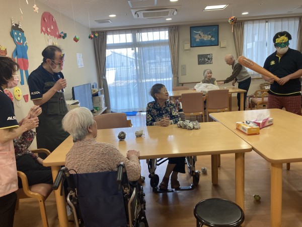 鬼に扮したスタッフに対し、おには~外と新聞紙で作った豆を全力で投げられていました。