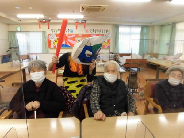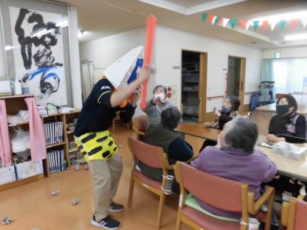という事で、スタッフというより主にセンター長が鬼に紛れてやってきたので、ご利用者様が豆という名の丸めた新聞紙で退治です!