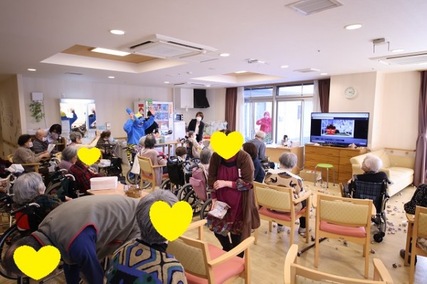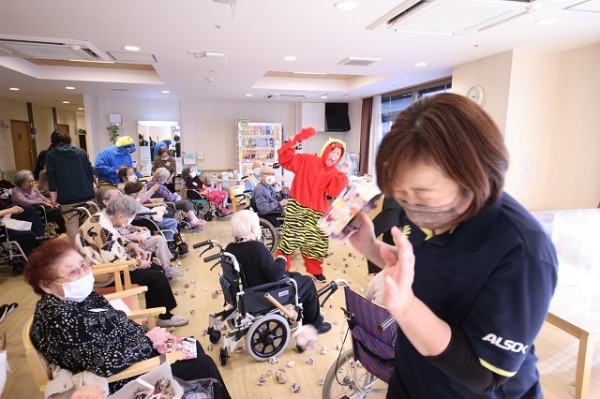 すでに準備体操済み(笑)の利用者皆さまの豆まきの激しい勢いに流石の鬼たちもタジタジ(;゚Д゚)