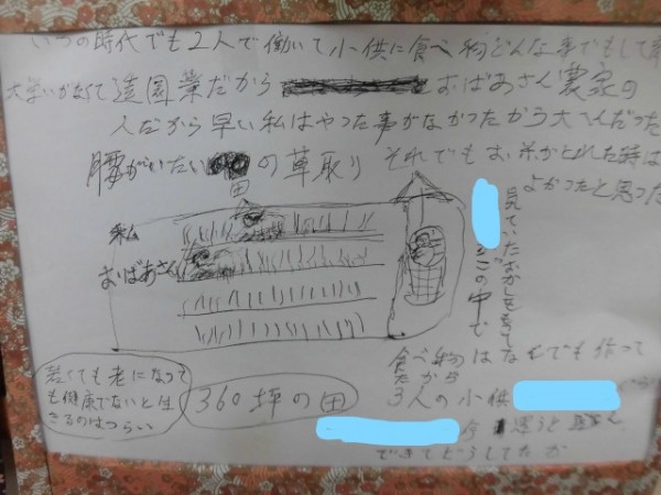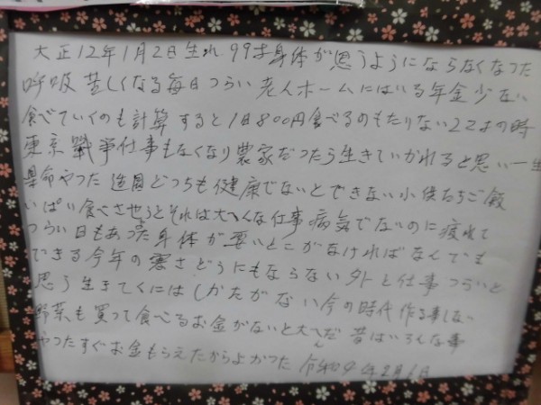 こちらの作品になります。朝遊蓮田に来られた際に、こちらの2枚の紙を手渡され「これ私の人生エピソードだよ。良かったら紹介してくれるかな?」と言われたので、せっかくなのでこちらでも載せておきました。