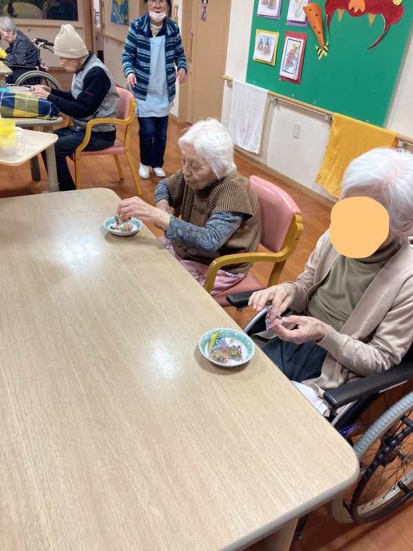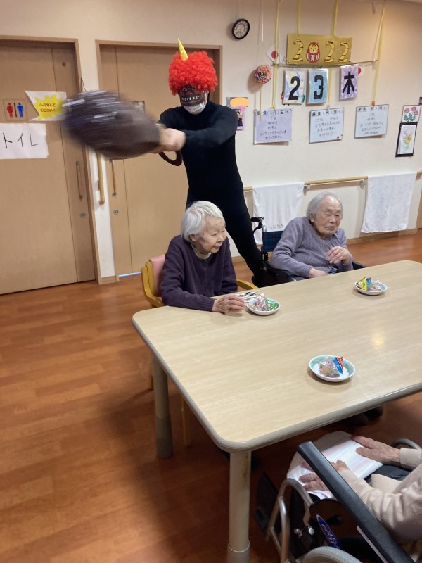 ご利用者様の皆様に豆をまいていただき鬼を追い払ってもらいました