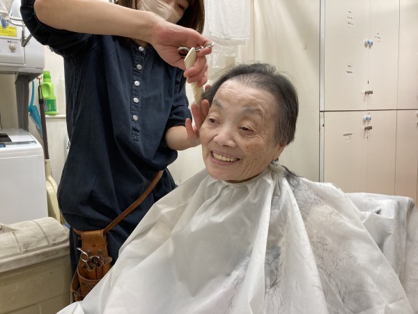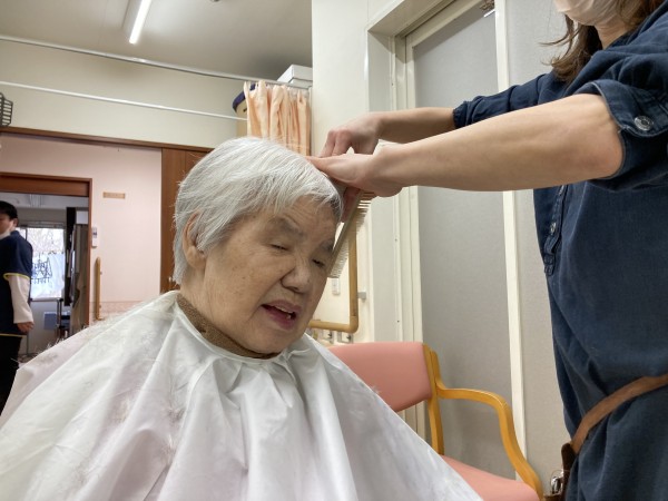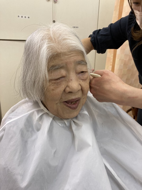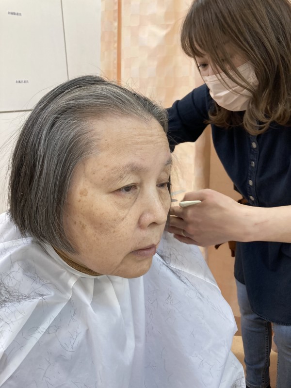 「この辺まで切って下さい」「少しだけ短くして」「う~ん…わからないから適当で…」など利用者様の好みもお伝えしながら切ってもらいました。