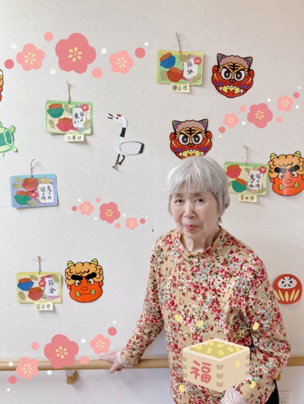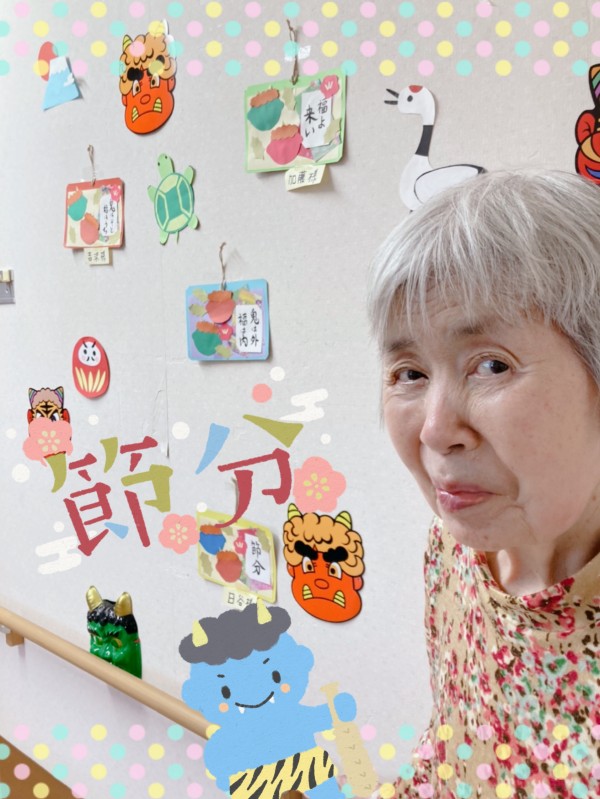 K様に「鬼がいますよ~」と伝えると「うふふ」と笑顔を浮かべて鬼の面を触っておられました。