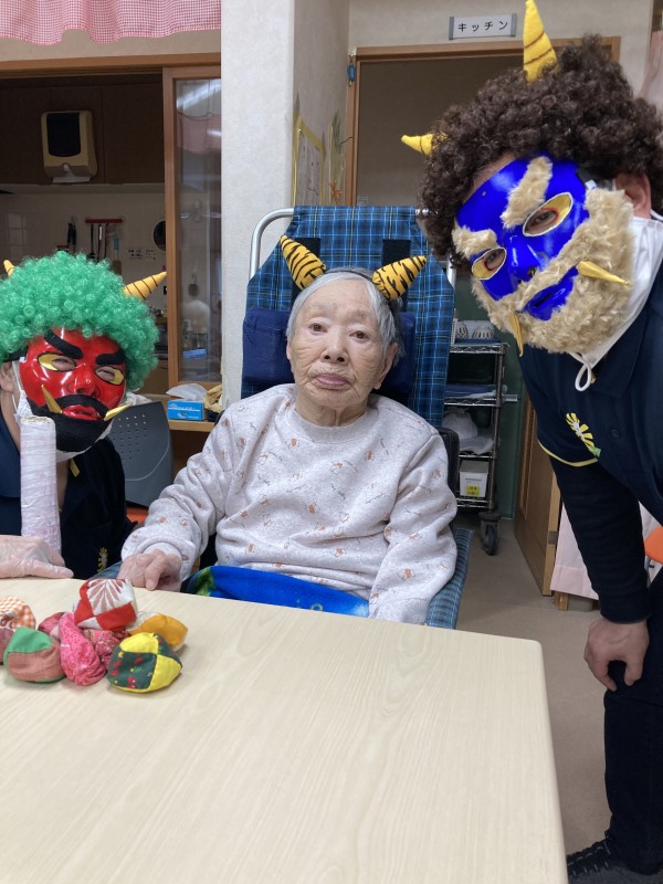 豆の代わりにお手玉で、ホーム長めがけて「鬼は外」「福は内」とやりましたが、皆様手加減しておりました(⌒∇⌒)