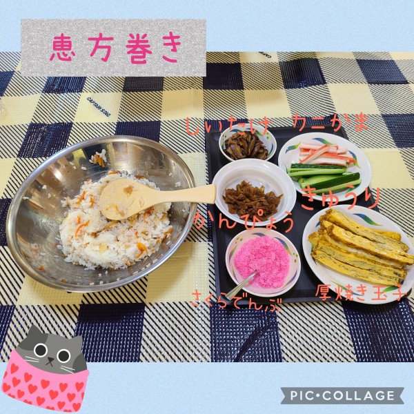 2月3日は節分です。先日豆まきは行いましたが、もう一つ大切な事、<恵方巻き>を皆さんで作りました。