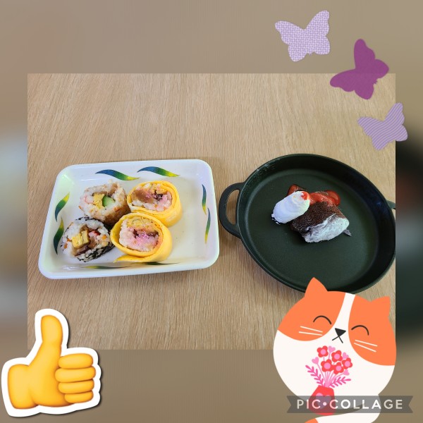 卵で巻いた黄金巻とご飯が残ってしまったので、冷蔵庫に眠っていた刻み海苔と、鰹節でN職員が巻いた恵方巻と、Y職員手作りのショコラケーキ