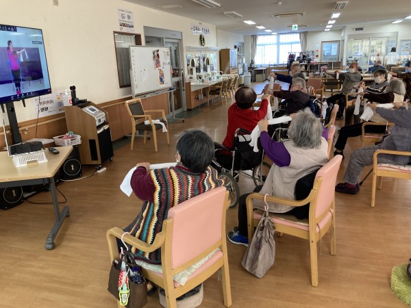 テレビ画面でリモートにて、体操を実施いたしました。タオルを使って、全身を使ったトレーニングを行い、利用者様も「疲れた」と