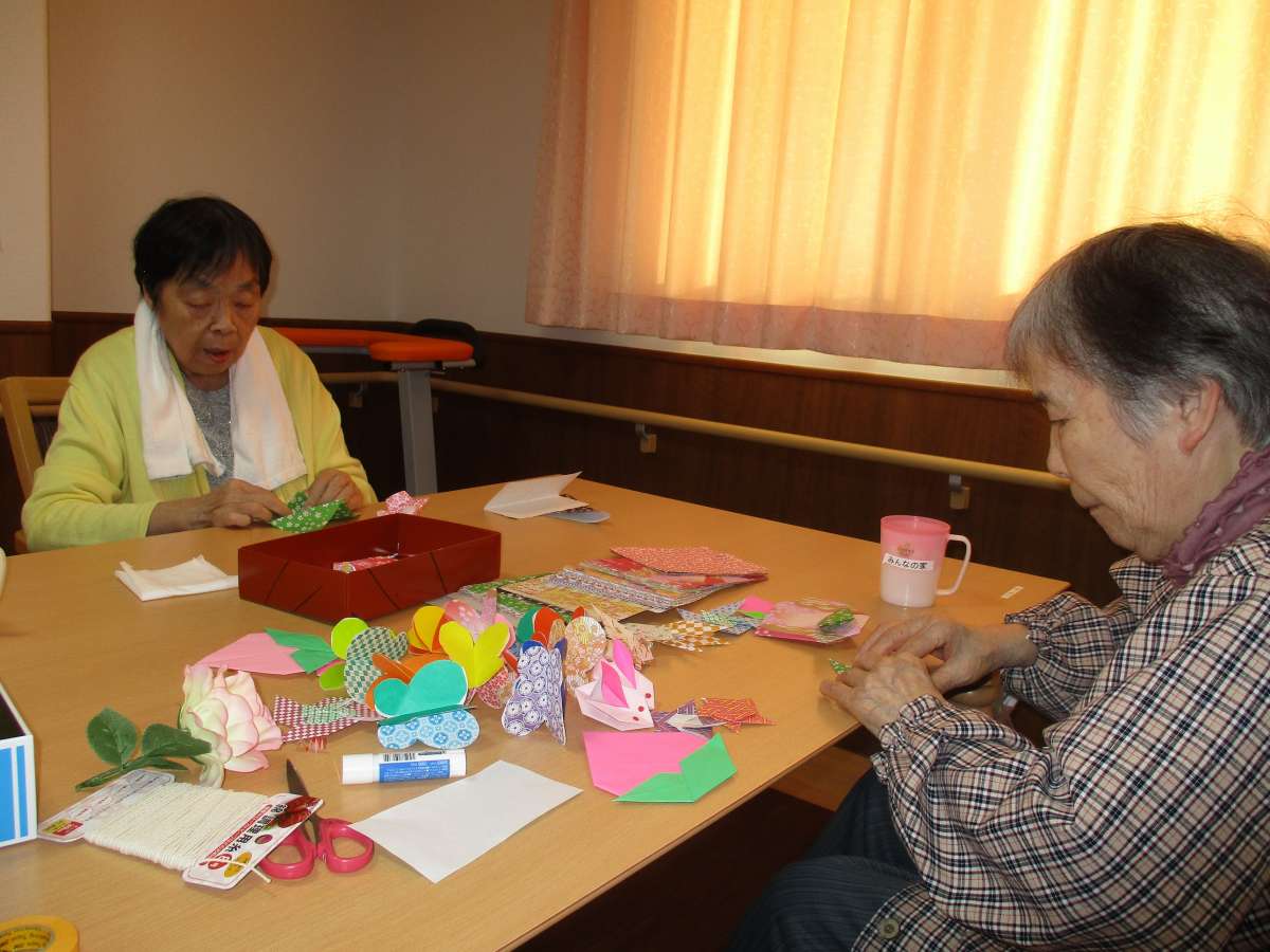 毎年恒例のひなまつりを数日後に控えて、ご利用者様から「何か作ろうよ」と相談がありました。みなさん得意な折り紙で、ひなまつりの飾りを作ることになりました。