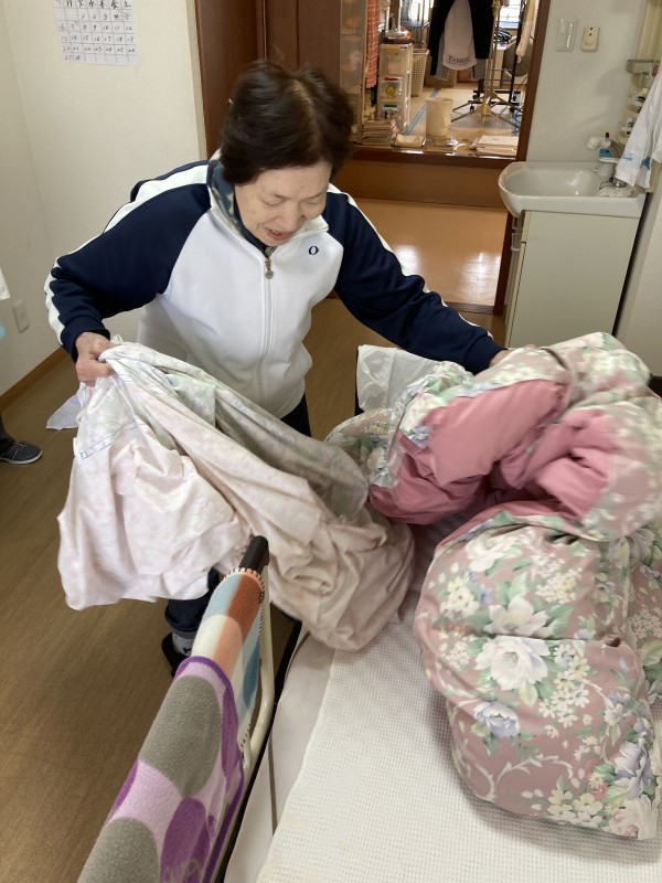 週に一度のシーツ交換日。「この前替えたばっかりだよ」と言うも職員が交換を始めると、「一緒にやりましょう」と、ご自分のカバーを外し始めました。「こうでいいんだっけ?」など職員に確認しながら進めます。新しいシーツを伸ばし、カバーをはめ、きれいになりました。「さっぱりして気持ち良いね!」今夜は気持ちよく眠れそうですね♪