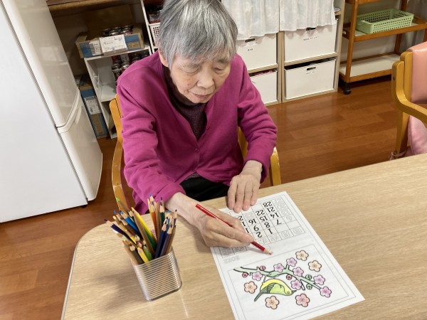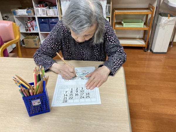黙々と塗られる利用者様、職員が誘い隣で塗り始めるが、スーッと横にずらし見向きもせずマイペースに新聞をご覧になる利用者様…