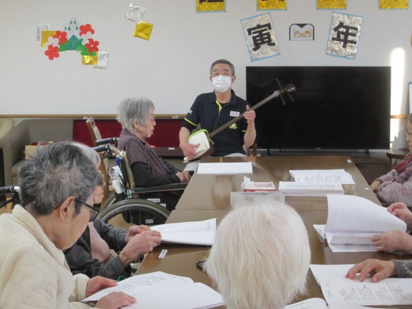 ご利用者様の皆様も三味線に合わせて大合唱♪大きな声で歌って健康に(*’ω’*)