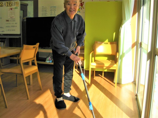 こんにちは!グループホームみんなの家・あきがせの介護ブログです!よろしくお願いいたします。ホールや廊下のお掃除をしているご様子です!! 筋力維持できたようです( ^ω^)・・・