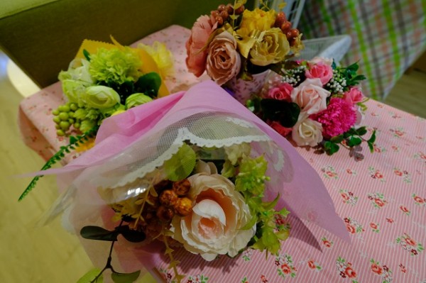 2月お誕生日を迎えるご利用者さまにキレイな花束、美味しいものを準備します(^_-)-☆