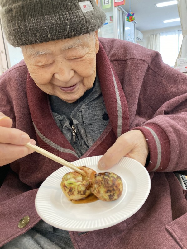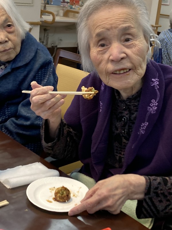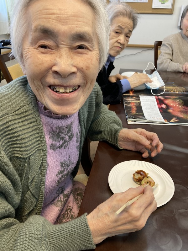前回のブログではたこ焼きの準備の様子を紹介しましたが、今回は皆様で召し上がる様子です。皆様一緒に作ったので、ただ食べるだけのおやつよりもよりおいしく感じたと仰って頂きました。