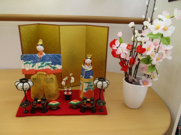 こちらは、職員のお母さまの手作りひな人形です。「かわいい。良くできてるねえ。」とご利用者様にも職員にも評判です。